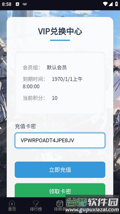 4、登录后输入获得的充值卡密,点击立即兑换即可完成激活。