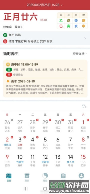 2、进入日历界面选择日期,可查看当天公历农历转换、吉时建议以及黄历宜忌事项。