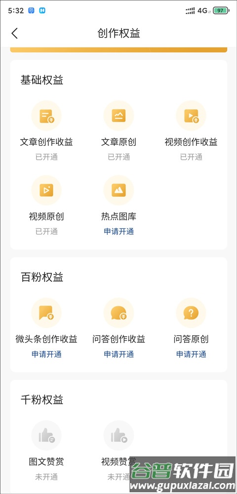 3、权益分为基础权益、百粉、千粉、千份、万粉等多个等级,新账号仅可开通最基础的权益;