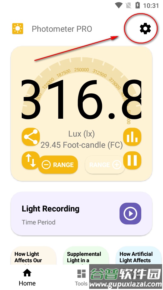 这款应用免费测量环境光传感器接收的光照强度,单位是勒克斯。照度取决于入射光的总量及其覆盖的面积。