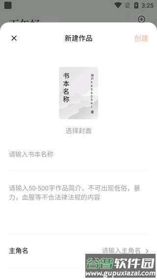 3、填写书名、作品简介、主要角色名称及目标读者群体等信息,最后点击创建即可开始发布作品。