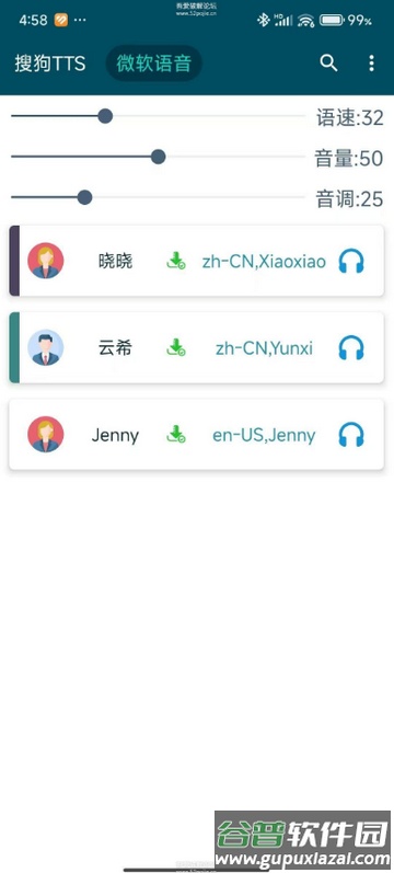 4. 单击即可选择发音声音;长按发音人头像区域,可以调节语速与音调参数。