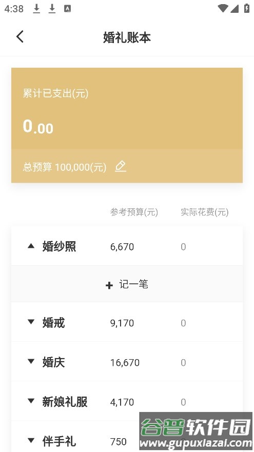 4.在婚礼账本页面,可以详细记录并分类查看所有婚礼相关支出;