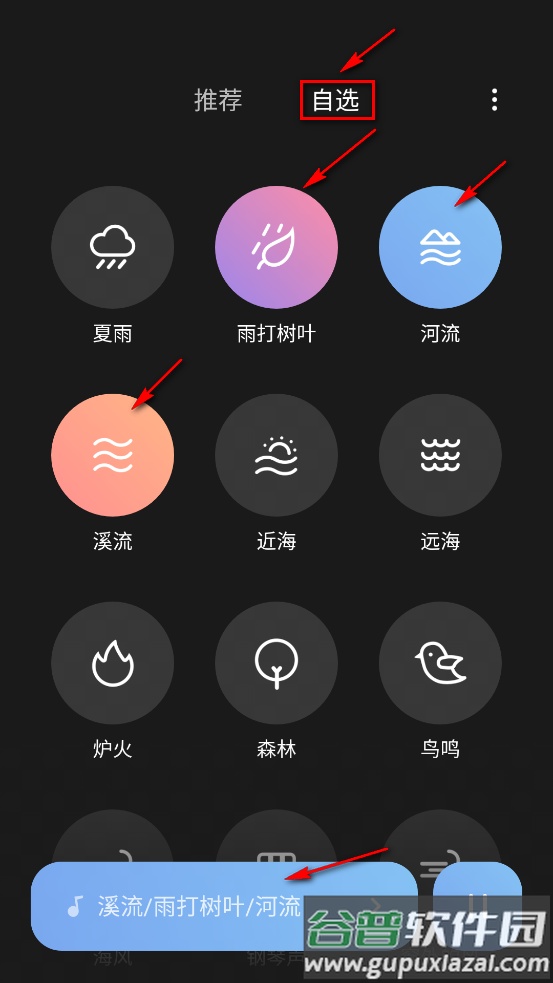 1、点击【自选】按钮,可以从库中挑选一至三种你喜欢的声音进行组合;