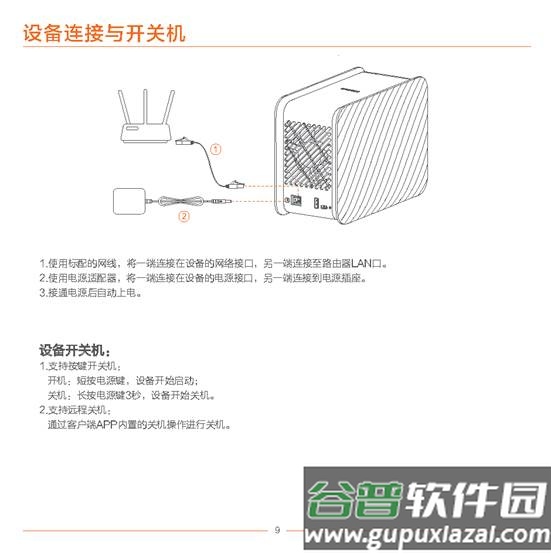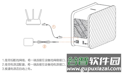 2、使用随附的六类网线,将设备连接到路由器的LAN口;接通电源适配器,一端连接设备,另一端插入电源;设备通电启动后,指示灯从白色缓慢亮起,最终变为橙色闪烁状态。