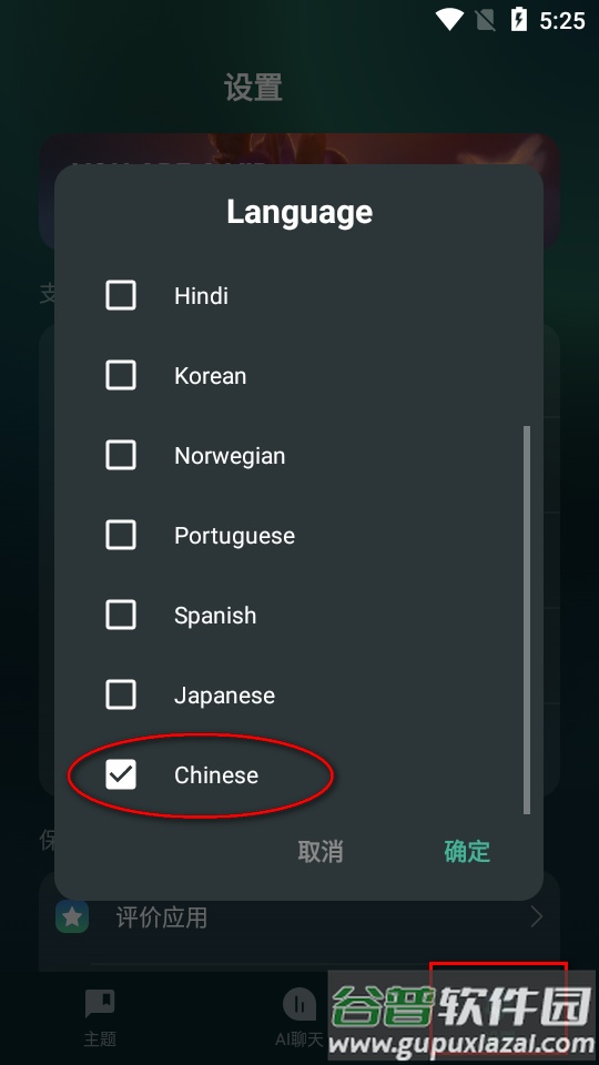 3、点击语言选项,选择列表最下方的中文即可完成设置。