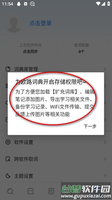 2、进入账号页面后,找到并点击词典库管理选项,根据提示开启必要的存储权限。