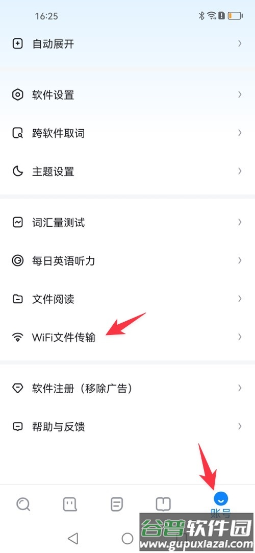 4、接着,在账号页面内找到WiFi文件传输功能并点击。