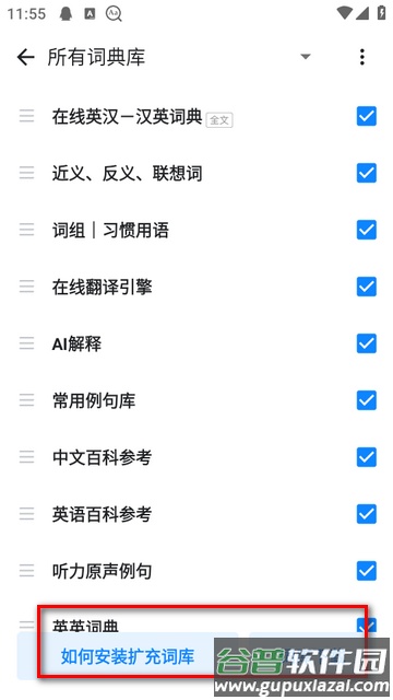 7、完成传输后,返回手机客户端的词典库管理界面,即可看到并启用新导入的词典。
