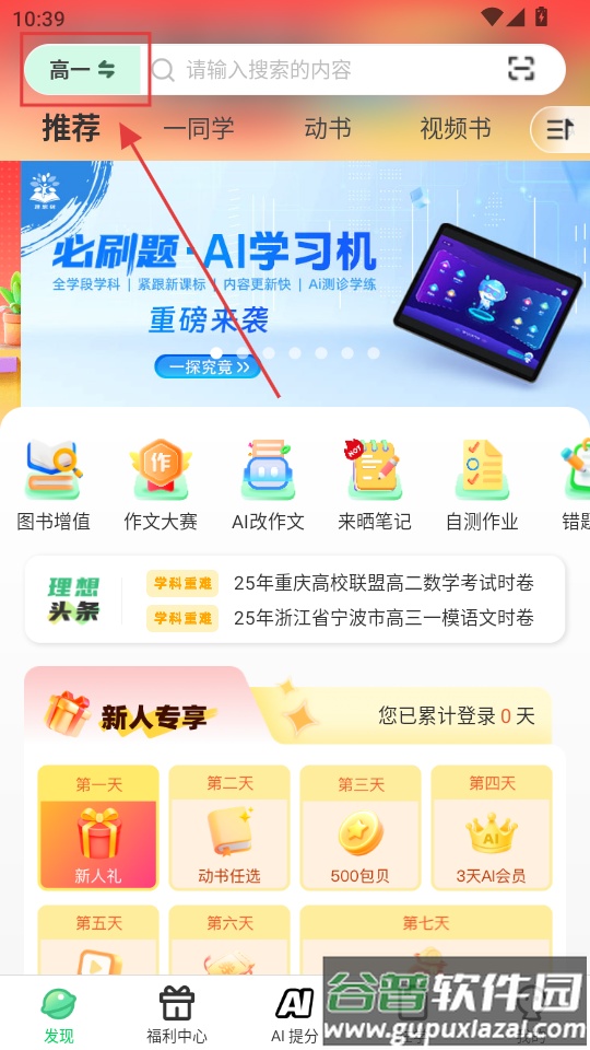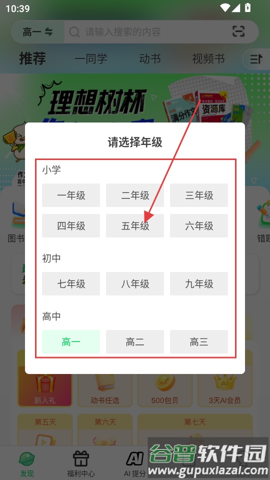 1、初次打开软件时可按提示选择所在年级,后续也可在首页左上方进行调整;