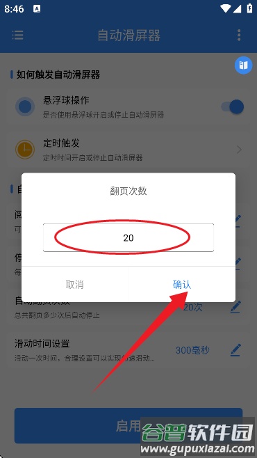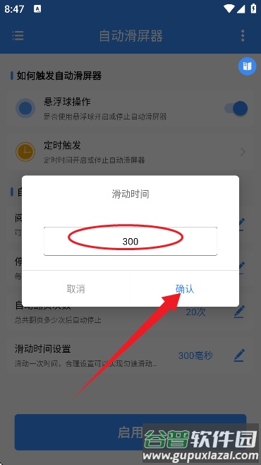 7、最后设置滑动时间参数,点击启用按钮即可开始自动滑动。