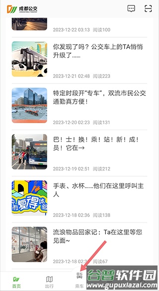 1、安装并打开成都公交App,在首页下方找到并点击中间的【乘车】按钮;
