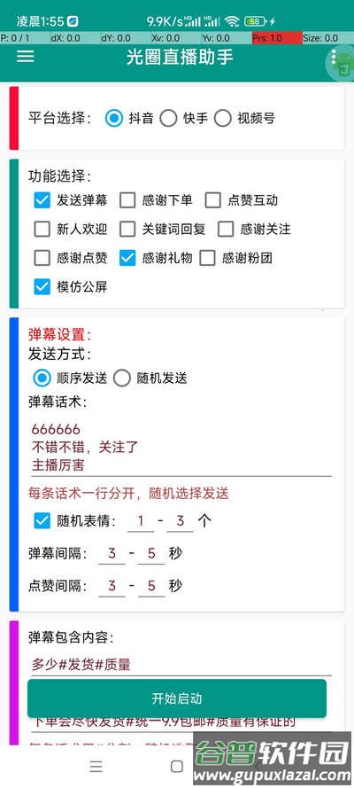 3、在软件界面输入相应参数,选择对应的直播平台与所需功能;