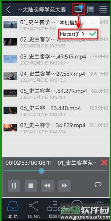 3、点击应用内右上角的电脑图标,选择列表中名为Macast的设备;接着在手机里挑选一个视频文件。