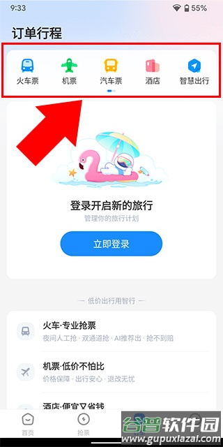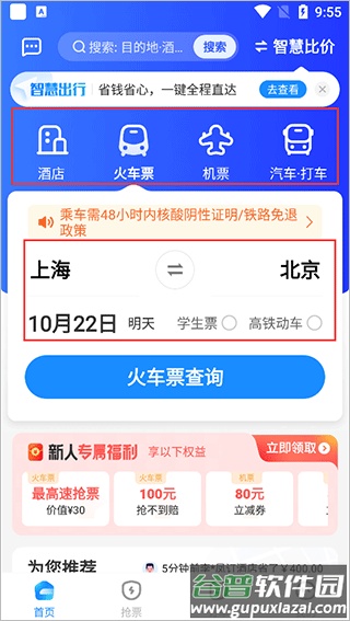 1、进入软件后在首页就能看到火车票、机票、汽车票等买票功能,选择时间、出发地和目的地,然后点击查询;