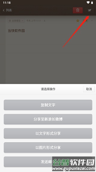 3、进入具体便签后,点击右上角功能按钮,可直接将内容分享到新浪微博。