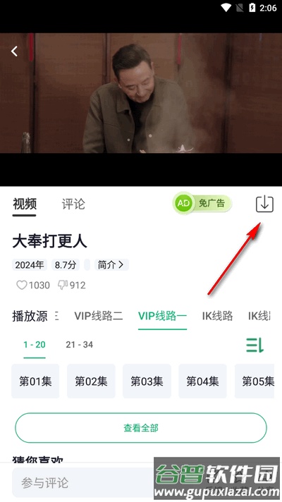 2、进入播放页面,选择具体集数,点击下载按钮。