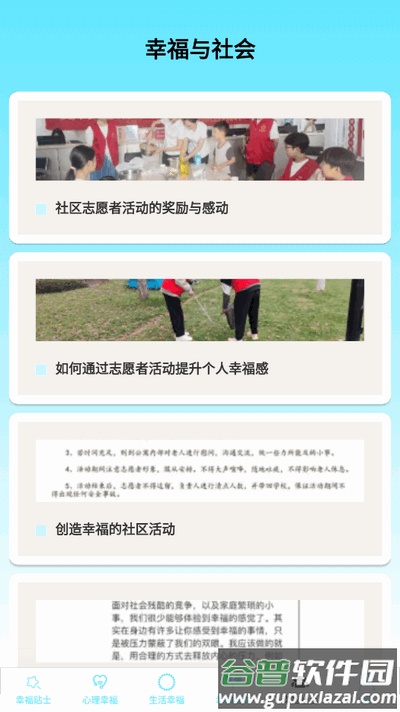 5、幸福社会板块分享建立良好人际关系的技巧,帮助用户营造积极正向的社交圈,通过互动与分享让生活更加丰富。