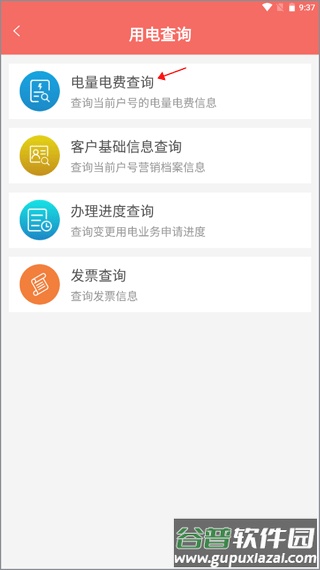 2、也可点击【用电查询】功能,选择电量电费查询选项进入详细页面;