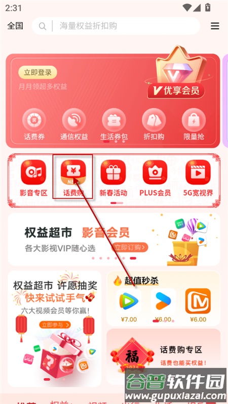 1、下载安装应用后,使用手机号登录,进入首页找到话费购专区;