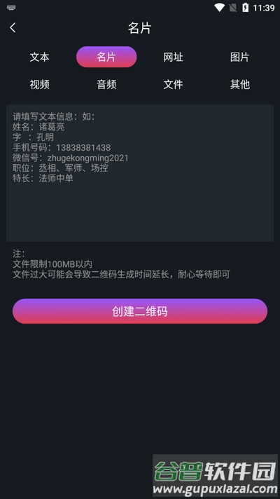 名片生成:创建个人社交名片二维码,扫码即可交换联系方式,提升社交效率;