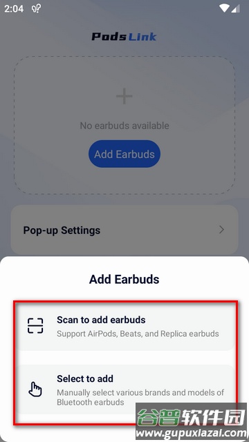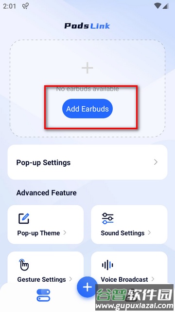 1、首先在本站下载并安装PodsLink软件,点击上方的Add Earbuds按钮来添加耳机。