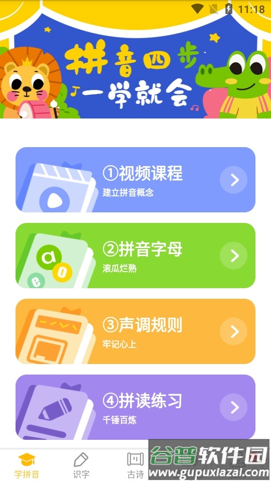 1、采用分阶渐进模式,将拼音学习划分为四个有序步骤。