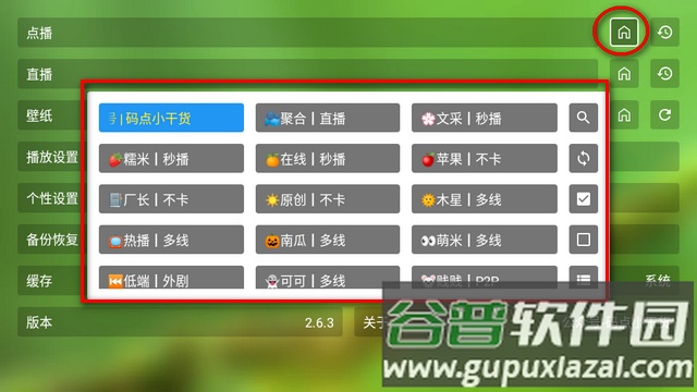 3、在设置菜单的点播栏目中,点击房子图标可进行接口切换。