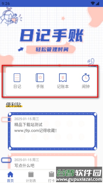 2、首页提供了日记、手账、记账本及闹钟等核心功能的入口。