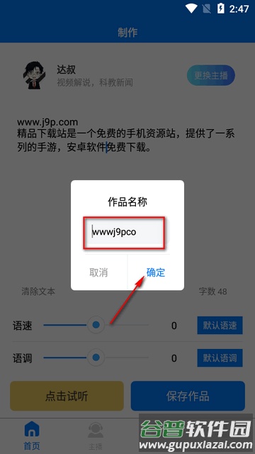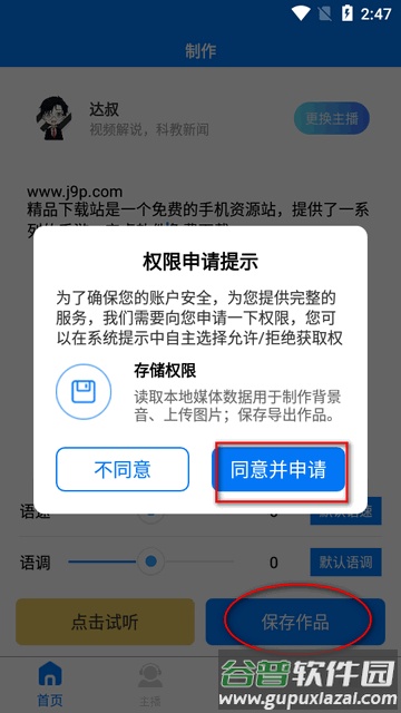 4、对生成的配音感到满意后,点击保存作品选项,并根据提示授予相关权限。