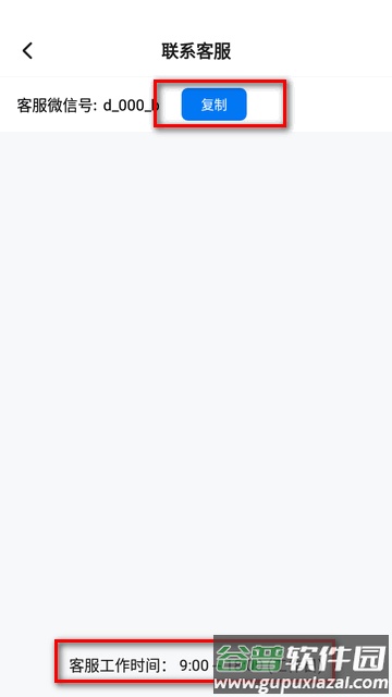 2、软件会显示客服的微信号,点击复制后,前往微信添加好友即可联系。