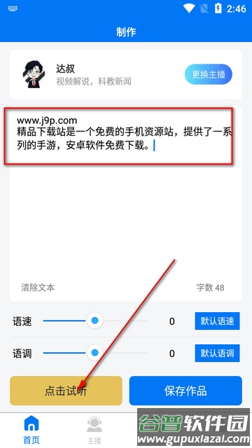 2、在软件主界面输入需要转换成语音的文字内容,点击试听按钮预览效果。