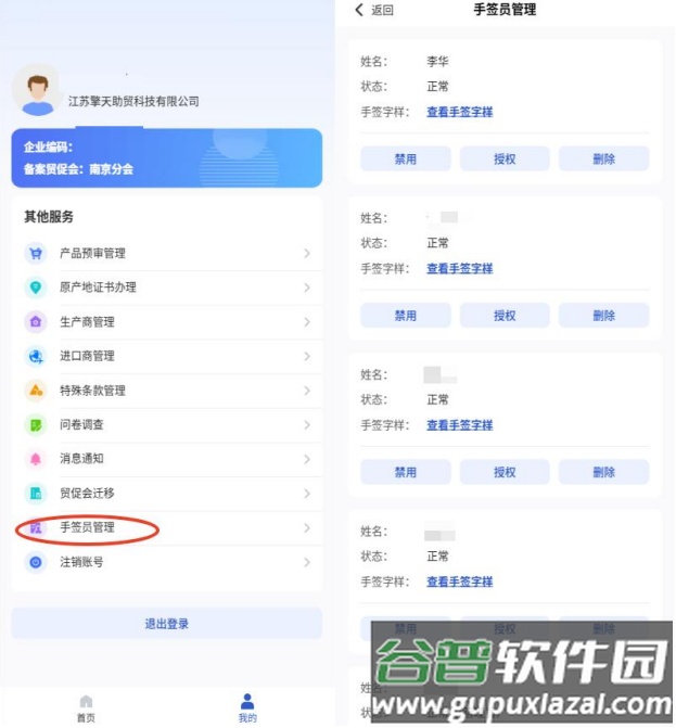 1. 进入我的页面,选择其他服务中的手签员管理。