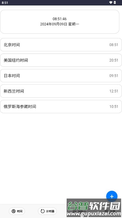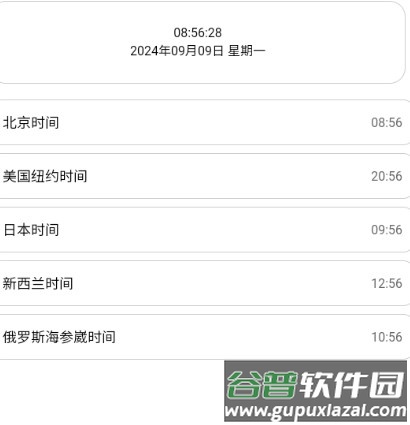 2、打开应用进入主页,可直观查看世界时间功能,其中展示了全球主要城市的当前时间与时区偏移;
