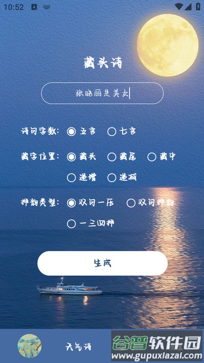 1、启动软件,依次选择诗句字数、藏字位置与押韵类型,并输入需要隐藏的句子。