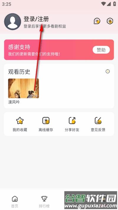2、在个人页面中,选择上方的“登录/注册”按钮。