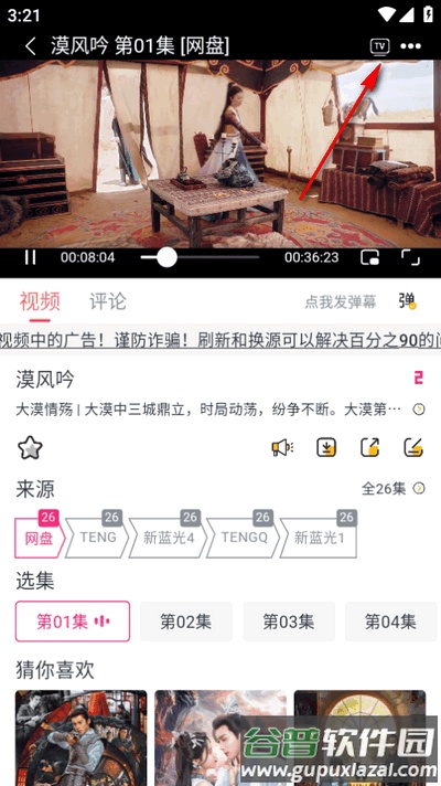 2、播放界面右上角会出现TV图标,点击它开始投屏。