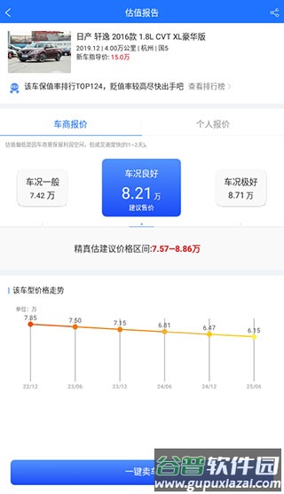 2、估值:通过四个步骤即可完成快速评估;用户可选择六项具体车况进行更精细的评估,使结果更贴近车辆实际状态,实现快捷且准确的估值服务。