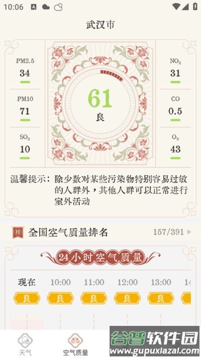 3、日出日落:动态呈现日出日落时间,并附有空气质量、风力风速等提示信息;
