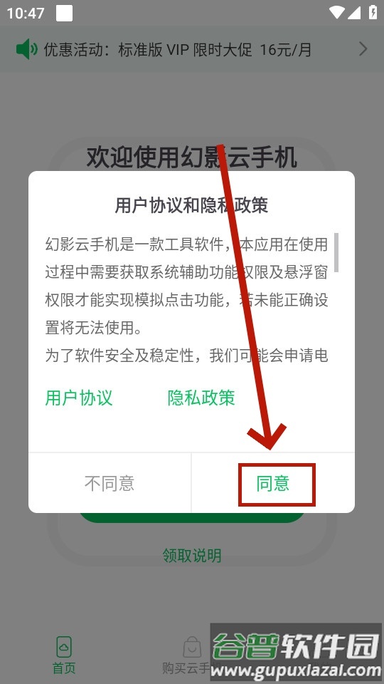 下载安装后打开幻影云手机应用,点击同意相关协议。
