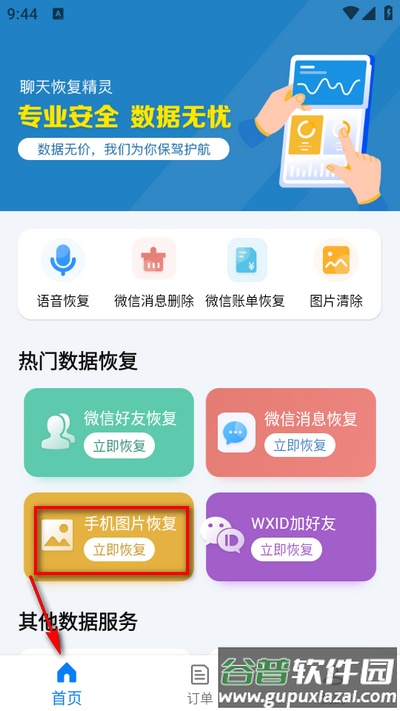1、进入软件主界面,点击首页的手机恢复图片选项。