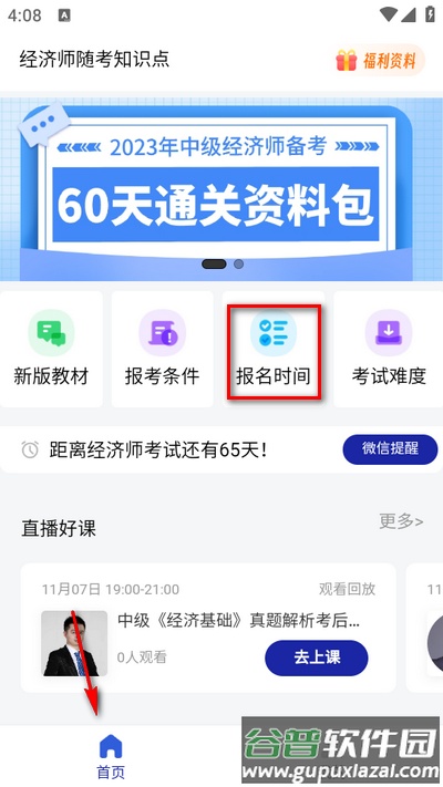 2、点击底部导航栏的“首页”,随后在页面顶部区域即可找到“报名时间”的查询入口。