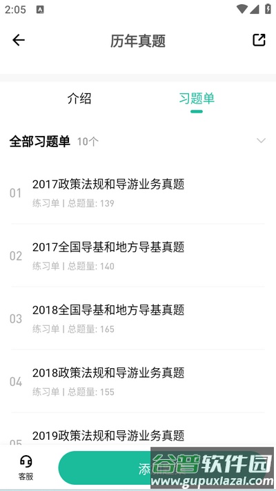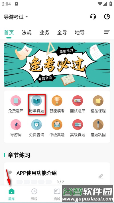 1、进入应用后,点击底部题库栏目,再选择顶部的历年真题入口。