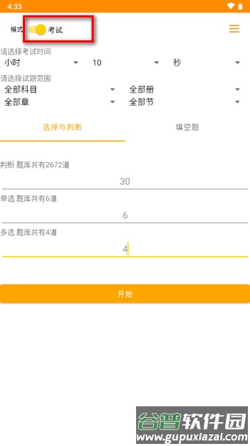 1、点击软件顶部模式切换按钮,即可从练习模式转为考试模式。