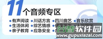 这些专区包括有声阅读、川话方言、四川曲艺、音乐欣赏、生活休闲、综艺情感、健康养生、人文国学、亲子教育、应急安全以及广播剧。
