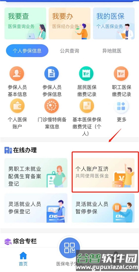 2、进入首页“在线办理”模块,选择“个人账户互济”功能;
