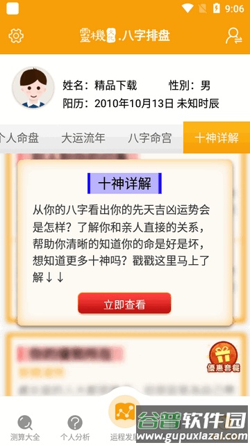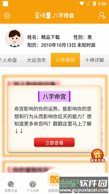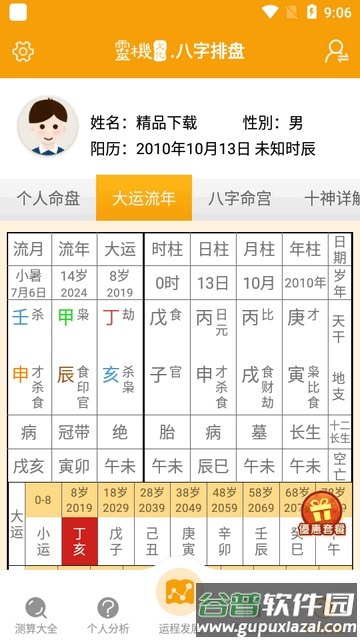 4. 专业排盘:免费查看八字命盘与大运流年分析;通过八字论命宫了解先天命相;借助十神解说查看先天运势的吉凶贫富。