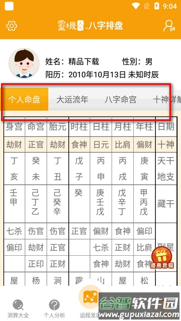 1. 个人分析:免费查看性格分析,用于初步体验;同时提供事业、情感、养生等方面的建议,通过先天命盘解读一生格局。