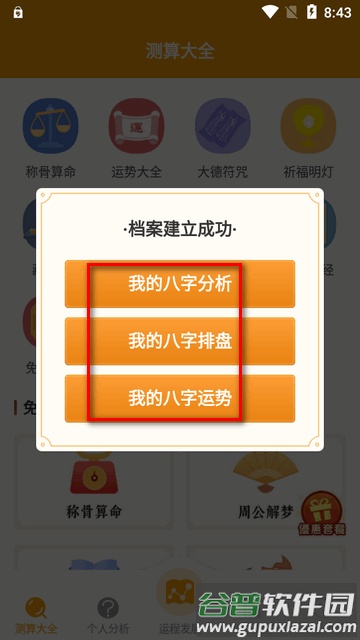 4. 档案建立成功后,即可直接查阅相关解读、排盘结果与运势信息。