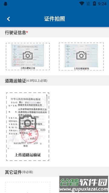 (2)车辆认证:上传行驶证与道路运输证,识别车辆信息,核对无误后提交备案。
